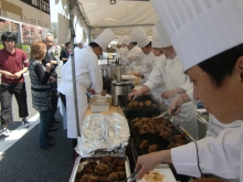 第44回草津宿場まつりに1年ぶりに参加。協会会員による出店・各お料理は、まつりを盛り上げ、一般の方々を引き付け、瞬く間に長蛇の列を作り、大盛況でした。担当ホテルで用意した料理は、ポークスペアリブ、ジャンボチーズ和えのミートソーススパゲティ、煮込みハンバーグのハヤシライス、南瓜のポタージュスープ、アップルパイ、各250から350食を完売、小さなお子様からお年寄りまで大変喜んでいただけた。昨年は、まつりが無かったので、「楽しみにしていた」との声を多数いただきました。